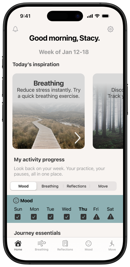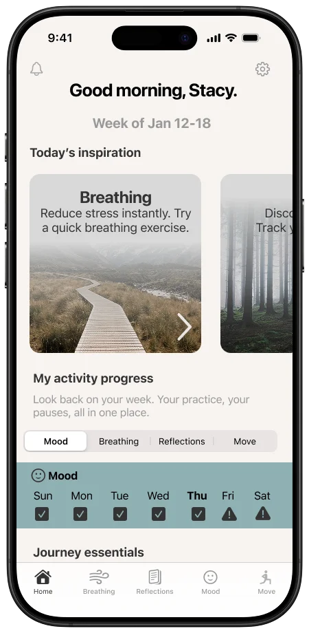 We recommend starting with a quick mood check-in or a guided breathing session. These take just a minute and help you get a feel for the app. You can then explore the four main features — Mood, Breathing, Reflections, and Move — at your own pace.